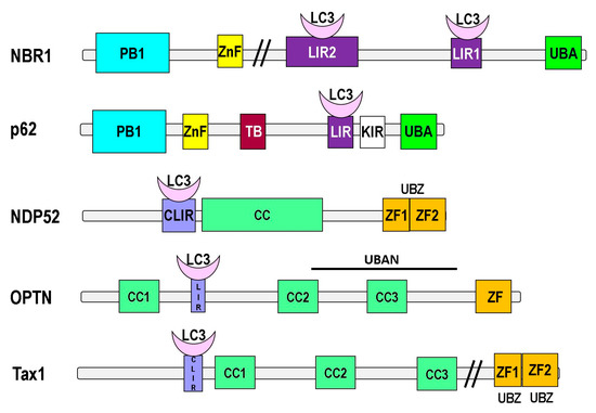 The sequestosome 1 (p62/SQSTM1), the first described mammalian autophagy receptor, is involved in regulating reactive oxygen species (ROS), apoptosis, inflammation, and autophagy [53,54,55]. It consists of an N-terminal Phex and Bem1p (PB1) domain [56], a zinc finger (ZnF) domain, Light Chain 3 (LC3) interacting region (LIR) [53,57], TRAF6-binding (TB), and ubiquitin-associated (UBA) domains [55] (Figure 3). The Keap-interacting region (KIR) interacts with Keap1 and affects the transcription factor Nrf2 and thereby controls ROS level [58]. The PB1 motif allows p62 to interact with itself and other PB1 domain-containing proteins and thereby hetero-, homo-, or polymerize. It is assumed that p62 first self-oligomerizes via its PB1 domain and thereby initiates aggregate formation of polyubiquitylated proteins, because individual p62 units poorly interact with ubiquitin [59]. In certain conditions, aggregates containing p62 and ubiquitylated proteins may even serve as a nucleating scaffold for autophagosome biogenesis, potentially by associating with mTORC1 and multiple Atg8/LC3 proteins [59,60]. The growing double membrane starts to enclose the p62-containing aggregates due to interactions between p62, Atg8/LC3, and other Atg proteins [61].