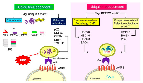 When the proteasomal function is inhibited and proteotoxic stress increases, Bcl-2-associated athanogene 3 (BAG3), is induced and interacts with HSP70 and with the dynein–dynactin motor complex to sequester proteins into aggresomes [1]. Therefore, Hsp70–Bag3 complex functions as an important signaling node that senses proteotoxicity and triggers protein aggregate formation [85]. Similarly, BAG-1 interacts with Hsc70 and Hsp70 chaperones, and functions as a link to the ubiquitin/proteasome system. Therefore, the BAG proteins, through their ubiquitin-like domain in the N-terminus, are considered sensors for enrichment of misfolded proteins and initiate the transport of aggregates to the lysosome for degradation (Figure 4). After interacting with the LAMP2A, the substrate is internalized through the membrane into the lysosomal lumen with the assistance of luminal HSC70 chaperone and rapidly degraded by luminal-resident proteases [86].