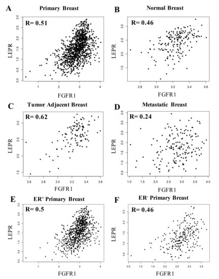 These new findings, in conjunction with prior studies demonstrating that leptin drives obesity-mediated breast tumor progression, provided rationale for analyzing the relationship between FGFR1 mRNA and the leptin receptor (LepR) mRNA in breast cancer []. Understanding this relationship may provide hypothesis-generating information on a tumor signature that could be sensitive to circulating or a local release of adipokines. In additional breast cancer analyses, RNA-Seq samples were collected from TCGA and processed using an in-house pipeline []. Elevated LepR mRNA and FGFR1 mRNA were positively correlated in primary breast tissue (R = 0.51), in areas adjacent to the tumor (R = 0.62), and to a lesser extent in normal tissue (R = 0.46) (Figure 1A–C). A weaker association was observed in metastatic tumors (R = 0.24) (Figure 1D). The positive association in primary breast tissue was similar when patients were stratified based on their subtypes (ER+, R = 0.50; ER−, R = 0.46) (Figure 1E–F). Collectively, these data demonstrate a positive association between FGFR1, leptin, and the LepR in human primary breast cancer and a much weaker association in metastatic tumors.