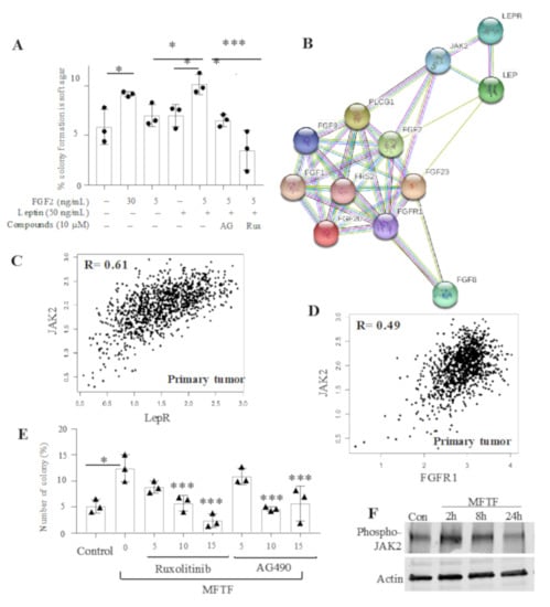 Validation of FGF2 and leptin and their inhibitory effect due to Jak2 inhibitors. (A) MCF-10A cells grown in presence of different concentrations of FGF2 and leptin showed enhanced growth when combined. (B) Protein network analysis performed between leptin receptor and FGFR1 demonstrate that both proteins are implicated in activating the Jak2 pathway. In primary breast cancer, (C) leptin receptor (LEPR) shows a correlation of 0.61 with Jak2 mRNA and (D) FGFR1 shows a correlation of 0.49 with Jak2 mRNA. (E) MCF-10A cells were treated with 200 µg/mL of mouse fat tissue filtrate (MFTF), treated with Ruxolitinib and AG490, and showed decreased average epithelial transformation in a dose dependent manner. (F) MCF-10A cells were treated with 200 mg/mL of MFTF for 2, 8 or 24 h and protein was probed with an anti-phospho-JAK2 antibody. MFTF stimulates JAK2 phosphorylation at 2 h. STRING DB (https://string-db.org/) was used to perform protein network analysis. PLCG1: Phospholipase C gamma, FGF2: Fibroblast growth factor, LEP: Leptin, LEPR: Leptin receptor, FRS2: Fibroblast growth factor receptor substrate 2, Jak2: Janus kinase 2. * p < 0.05, *** p < 0.001. FGF = Fibroblast growth factor. PLCG1 = Phospholipase C Gamma 1.