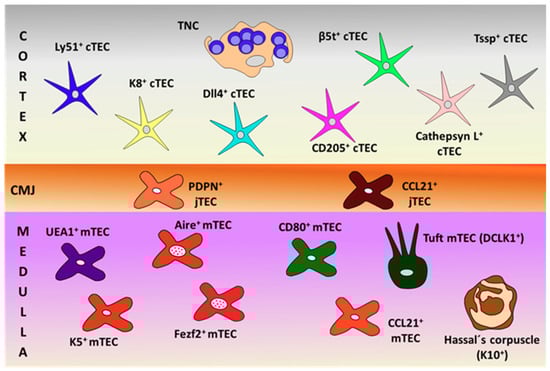 - Kadouri, N.; Nevo, S.; Goldfarb, Y.; Abramson, J. Thymic epithelial cell heterogeneity: TEC by TEC. Nat. Rev. Immunol. 2020, 20, 239–253. [Google Scholar] [CrossRef]