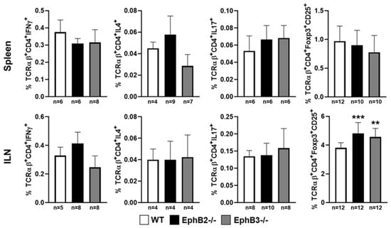 Proportions of Th1 (TCRαβ+CD4+IFNγ+), Th2 (TCRαβ+CD4+IL4+), Th17 (TCRαβ+CD4+IL17+) lymphocytes, and Treg cells (TCRαβ+CD4+CD25+FoxP3+) in both spleen and inguinal lymph nodes (ILN) in EphB-mutant mice. The significance of the one-way ANOVA test with Tukey post hoc test between WT and mutant values is indicated as: ** p < 0.01; *** p < 0.001. n, number of studied animals.