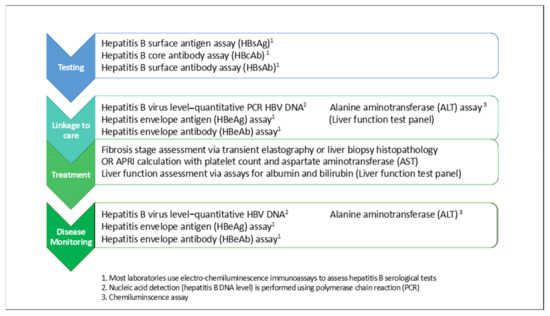 The hepatitis B cascade of care involves multiple steps: screening, diagnosis, linkage to care, assessment of liver disease stage and treatment eligibility, then treatment and/or monitoring, including surveillance for hepatocellular carcinoma (HCC) (Figure 1). Laboratory blood tests are required at every step of the care cascade, including blood tests for hepatitis B serology, quantitative hepatitis B virus (HBV) DNA level by polymerase chain reaction (PCR) and liver function tests (Figure 1). These tests require laboratory resourcing, technology and expertise beyond existing peripheral laboratory capabilities in many low-resource and geographically isolated regions [14,15,16]. In many countries, laboratory services are centralised due to high costs and limited skilled technician capacity; however, transport of blood samples from regional to centralised laboratories presents its own challenges in geographically isolated or insecure regions, particularly if cold chain supply must be preserved [14]. Cost is another major limitation: Price reductions for diagnostics have fallen slowly over time compared with medication costs, and hepatitis B diagnostic tests cost more than therapy in many low-income countries [16,17]. Moreover, the requirement for lifelong monitoring for most people living with hepatitis B that involves regular blood tests [4,5], combined with barriers to timely healthcare access such as hepatitis B-related stigma [18,19], healthcare costs for users and providers [20] and the logistics of accessing consistent, high-quality, affordable healthcare services in a timely manner are major barriers for people to receive guideline-based care [16]. These barriers lead to significant attrition from every step of the hepatitis B care cascade over time, and those lost from care represent missed opportunities for treatment and liver cancer prevention [16,21].