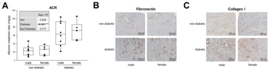 Accumulation of ECM results in a somewhat later phase of TIF, in that fibronectin and collagen IV are major ECM proteins that serve as a scaffold for the deposition of other proteins, such as collagen type I and III [17,43]. Immunohistochemical staining for fibronectin and collagen I shows the same picture as for ACR: a significant increase due to DM but no apparent sex differences (Figure 1B,C).