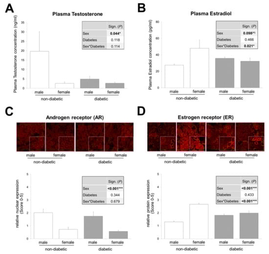 Our data provide a complete picture of the imbalance of sex hormone levels and the expression of their receptors in both sexes in the presence of T2DM and reveal a sex–diabetes interaction for plasma estradiol as well as for ER expression, which is shown for the first time in our study.