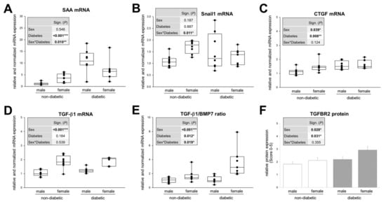 Our expression data show a significant influence of sex on the expression of CTGF, TGF-β1, the relationship between TGF-β1 and BMP7 expression and the TGFBR2 protein level. Diabetes, on the other hand, significantly influences the expression of SAA, CTGF, the TGF-β1/BMP7 ratio and TGFBR2 expression. A significant effect interaction between sex and diabetes is shown in the mRNA expression of SAA, although no significant single sex effect occurs (Figure 4A). Interestingly, there is also a very strong sex–diabetes interaction in the expression of Snail1, although here, based on the two-way ANOVA significance analysis, neither sex alone nor diabetes alone causes a significant major effect (Figure 4B). When the expression pattern of SAA, Snail1 and CTGF is analyzed in intergroup comparisons (one-way), some similarities become apparent. Firstly, the basal expression is significantly higher in female healthy kidneys compared to healthy males. Secondly, the diabetes-induced upregulation as in males is fewer or no longer detectable in females. Thirdly, as a result of the first two mentioned, no sex differences in diabetic mice are detectable (Figure 4A–C). This could provide an explanation for the conflicting literature data, since single comparisons of diabetic males and females or the influence of diabetes in only one sex may lead to wrong conclusions if the basal data are not known or not included.