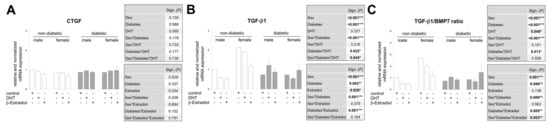 While Figure 5B shows the potential influence of the sex hormones DHT and β-estradiol on TGF-β1 expression depending on sex and diabetes phenotype, we investigated in a next step, a possible effect of the hormones on TGF-β1 signaling. Further, in an ex vivo approach, we stimulated renal tissue, this time exclusively from non-diabetic females and males, with low and high concentrations of TGF-β1 in the absence and presence of exogenous sex DHT or β-estradiol. The relative mRNA expression of CTGF as the main downstream mediator of TGF-β1 served as readout for TGF-β1 signaling.