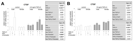 Figure 7 shows the relative CTGF mRNA levels after 24 h stimulation with low dose TGF-β1 (Figure 7A) and high dose (Figure 7B). Under these controlled conditions, a TGF-β1 dose effect is shown in the form that the higher TGF-β1 concentration induces CTGF expression most strongly (comparison of TGF-β1 minus DHT/β-estradiol in Figure 7A vs. Figure 7B), but this is also shown a long time ago [75,76]. Much more interesting is that, as in the ex vivo approach, an opposite effect of DHT is obvious, which is TGF-β1 dose-dependent: DHT enhances low dose TGF-β1-stimulated CTGF expression and lowers high dose induced CTGF levels almost to basal levels. Estradiol shows the same effect as DHT in TGF-β1-treated TKPTS cells, again qualitatively distinct depending on the TGF-β1 concentration: Estradiol increased CTGF expression induced by low dose TGF-β1 and decreased CTGF levels triggered by high-dose TGF-β1 (Figure 7A,B).