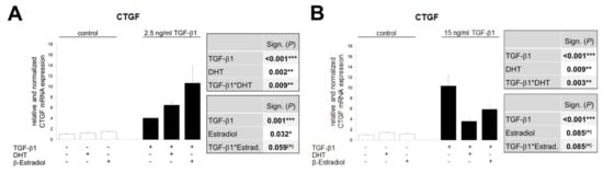 Real-time PCR analysis of mRNA expression in TGF-β1-treated TKPTS cells. (A) Cells were stimulated for 24 h with control or 2.5 ng/mL TGF-β1 and with or without sex hormones (DHT/β-estradiol), as indicated. CTGF mRNA levels were determined from duplicate samples in three independent experiments (yielding a total of n = 6 sample points). (B) Cells were stimulated for 24 h with control or 15 ng/mL TGF-β1 and with or without sex hormones (DHT/β-estradiol), as indicated. CTGF mRNA levels were determined from triplicate samples in four independent experiments (yielding a total of n = 12 sample points). (A,B) The significances, shown in the upper table, were assessed using two-way ANOVA with TGF-β1 (control or 2.5 or 15 ng/mL) and DHT as the two factors. The significances, shown in the lower table, were assessed using two-way ANOVA with TGF-β1 (control or 2.5 or 15 ng/mL) and estradiol as the two factors. TGF-β1, DHT, Estradiol: main effect of TGF-β1/DHT/Estradiol, respectively. TGF-β1*DHT, TGF-β1*Estradiol: interaction (determines whether the one main effect depends on the level of the other main effect). * P ≤ 0.05; ** P ≤ 0.01; *** P ≤ 0.001.