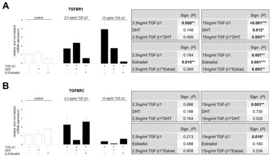 Effect of TGF-β1 on expression of TGF-β1 receptor 1 and 2 in TKPTS cells. (A) TGFBR1 mRNA analysis. Cells were stimulated for 24 h with TGF-β1 (control or 2.5 or 15 ng/mL) and with or without sex hormones (DHT/β-estradiol), as indicated (n = 4/6/2/6/6/2/2/5/3). (B) TGFBR2 mRNA analysis. Cells were stimulated for 24 h with TGF-β1 (control or 2.5 or 15 ng/mL) and with or without sex hormones (DHT/β-estradiol), as indicated (n = 3/3/2/3/3/3/4/5/3). (A,B) The significances, shown in the upper tables, were assessed using two-way ANOVA with TGF-β1 (control or 2.5 (left table) or 15 ng/mL (right table)) and DHT as the two factors. The significances, shown in the lower tables, were assessed using two-way ANOVA with TGF-β1 (control or 2.5 (left table) or 15 ng/mL (right table)) and estradiol as the two factors. TGF-β1, DHT, Estradiol: main effect of TGF-β1/DHT/Estradiol, respectively. TGF-β1*DHT, TGF-β1*Estradiol: interaction (determines whether the one main effect depends on the level of the other main effect). * P ≤ 0.05; ** P ≤ 0.01; *** P ≤ 0.001.
