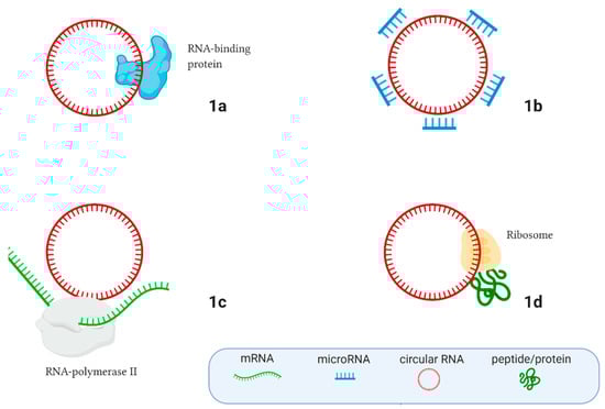 Circular RNAs (circRNAs) are most frequently non-coding, endogenous, single-stranded RNA molecules that play an important role in cell life. CircRNAs are covalently closed RNA molecules and often originate from protein-coding genes. Previously, it was thought that circular RNAs result from non-functional splicing errors that sometimes occur during the post-transcriptional processes in cells [18]. Currently, exonic, intronic, and exon-intronic circRNAs have been described in eukaryotes, but only a few of their functions have been revealed [19,20], and circRNAs remain almost entirely unexplored RNA molecules. The main circRNA cell functions are shown in Figure 1. CircRNAs can work like sponges that contain targets for RNA binding proteins (Figure 1a) and microRNAs (Figure 1b), thereby participating in gene expression regulation. They can also regulate gene expression by interacting with RNA polymerase II (Figure 1c), and can even produce peptides and proteins (Figure 1d) [19,20].