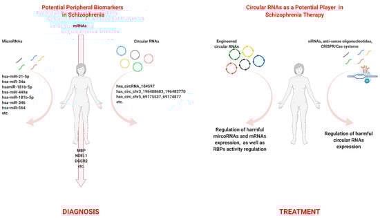 Recent studies have shown a significant impact of circRNAs on the origin and development of SZ, as well as an important role of circRNAs in other non-coding and protein-coding gene expression regulation [21]. Recently, Li and colleagues briefly reviewed circRNAs potential as diagnostic biomarkers for SZ and depression [22]. Here, we provide a more detailed review of the study results focused on the role of microRNAs (miRNAs), mRNAs, RNA binding proteins (RBPs) activity, and circRNA in SZ and discuss the potential implications of circRNAs as an important part of cell machinery, including new insights into the therapeutic potential of artificially engineered circular RNAs.