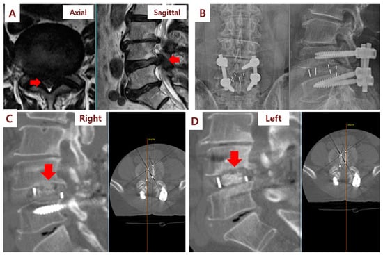 Illustration case (Patient No. 3): A 67-year-old male received posterior lumbar interbody fusion and pedicle screw fixation. (A) Preoperative lumbar axial and sagittal MRI demonstrating L4/L5 severe spinal stenosis. (B) Postoperative lumbar spine standing anteroposterior and lateral view. (C) CT sagittal view at 6 months after surgery showed fusion status (red arrow) of cages filled with SVF and β-TCP mixture on the right side of the patient. (D) By contrast, CT sagittal view showed no fusion status (red arrow) of cages filled with β-TCP alone on the left side.