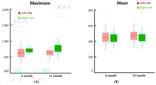 Maximum (A) and mean feature (B) values extracted from the axial plane of spine CT. The left and right sides are represented by red and green bars. The middle line is the mean value, the bar is the standard deviation, and the points are the feature values. The maximum is the largest Housfield unit (HU) value, and the mean is the average gray level intensity inside the region of interest (ROI).
