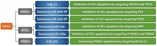 - Fu, X.; He, Y.; Wang, X.; Peng, D.; Chen, X.; Li, X.; Wang, Q. Overexpression of miR-21 in stem cells improves ovarian structure and function in rats with chemotherapy-induced ovarian damage by targeting PDCD4 and PTEN to inhibit granulosa cell apoptosis. Stem Cell Res. Ther. 2017, 8, 187. [Google Scholar] [CrossRef]