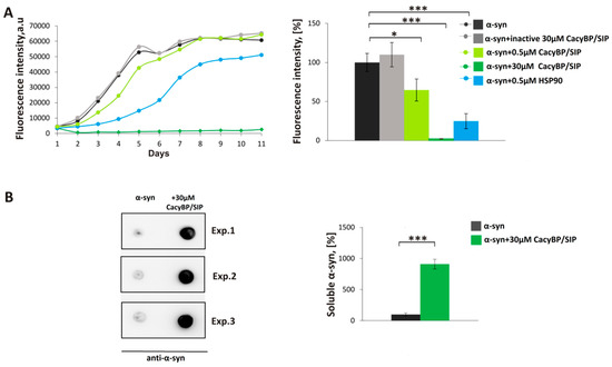 Influence of CacyBP/SIP on α-synuclein aggregation. (A, left panel) Representative curves showing ThT fluorescence of 30 µM α-synuclein alone (black) or in the presence of: 30 µM inactive CacyBP/SIP (grey), 0.5 µM CacyBP/SIP (light green), 30 µM CacyBP/SIP (green) or 0.5 µM HSP90 (blue). (A, right panel) Statistical analysis of the results for samples taken on day 4 of incubation (n = 3). (B, left panel) Dot-blots showing α-synuclein immunostaining in the soluble fraction (supernatant) in samples taken on day 4 of α-synuclein aggregation, alone or in the presence of 30 µM CacyBP/SIP and (B, right panel) densitometric analysis of the results (n = 3). Data, calculated as means ± SEM, are presented as percentage values. * p ≤ 0.05, *** p ≤ 0.001.