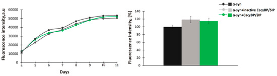 A study concerning the HSP70 chaperone has shown that the protein blocks the early stages of aggregation of tau protein, namely nucleation and elongation, and does not influence aggregation when added at later stages [32]. Thus, we tested whether CacyBP/SIP acts in the same fashion. For this purpose, 30 μM α-synuclein was incubated for 4 days at 37 °C and then 30 μM CacyBP/SIP or inactive CacyBP/SIP (negative control) was added. Subsequently, after 2 days, aliquots were taken and ThT fluorescence was measured. As it can be seen in Figure 3, CacyBP/SIP fails to protect α-synuclein from aggregation when added after initiation of the aggregation process.