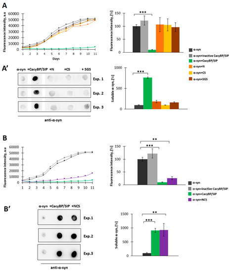 CacyBP/SIP is composed of three major domains: The N-terminal (N, residues 1–77), middle (CS, residues 74–178) and the C-terminal (SGS, residues 178–229) [27]. Hence, in the next step, we attempted to identify domain(s) of this protein responsible for inhibition of α-synuclein aggregation in vitro. We performed ThT assay and high-speed centrifugation followed by dot-blot analysis as previously described. The obtained results show that none of the CacyBP/SIP domains protects α-synuclein from aggregation (Figure 5A,A’).