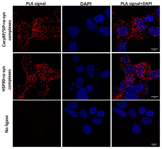 Presence of complexes formed between α-synuclein and CacyBP/SIP or HSP90 in HEK293 cells visualized by PLA (representative images). Complexes of examined proteins are shown as red dots; cell nuclei, stained with DAPI, are in blue. HSP90 was used as a positive control. Scale bar–10 μm.