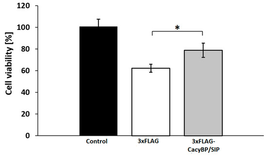 To understand the possible role of CacyBP/SIP in PD pathology, we measured viability of HEK293 cells overexpressing 3xFLAG-CacyBP/SIP and control ones (expressing FLAG tag alone) after rotenone treatment. As it can be seen in Figure 9 an increased CacyBP/SIP level augments viability of these cells by about 16%.