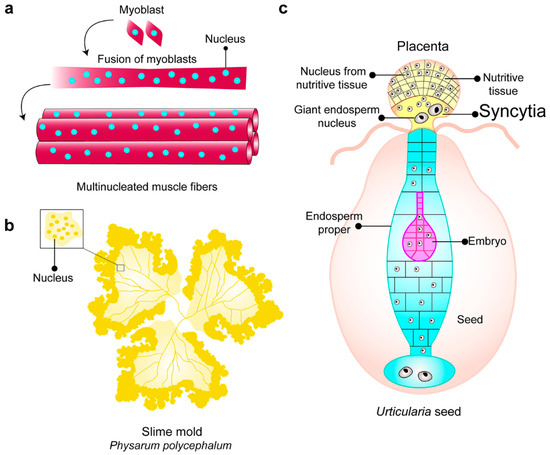 Examples of syncytia in nature. (a) Myoblasts are fused to form multinucleated muscle fibers. (b) Slime mold Physarum polycephalum, multinucleate protoplasm formed by the fusion of individual amoebae. (c) Endospermal–placental syncytia in developmental stages of Urticularia seeds, the formation of syncytia occurs in the placenta. The syncytia harbor two populations of nuclei, a nucleus from the nutritive tissue, and a giant endosperm nucleus (modified from [8]).