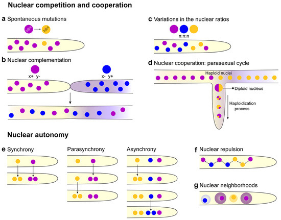 Nuclear patterns in multinucleate syncytia. (a) Spontaneous mutation in nuclei can give that nucleus an advantage or disadvantage over the rest of the nuclei in the syncytial population. (b) Nuclear complementation can occur if a nucleus lacks a gene (x− or y−) encoding a function necessary for survival. x− or y− function can be complemented by the presence of a second nucleus, which is functional for that gene (x+ or y+). Complementation between nuclei in a syncytium can occur with spontaneous mutations (a) or via complementation upon fusion with another individual that can produce the missing component. (c) In multinucleate syncytia, variations in the nuclear ratios can occur, where one nucleus can dominate. (d) Generation of nuclear heterogeneity through the parasexual cycle. Haploid nuclei in a heterokaryon, formed either by spontaneous mutation or via fusion with a different strain, undergo karyogamy to form a heterozygous diploid nucleus. Repeated rounds of mitotic recombination and mitotic nondisjunction result in loss of chromosomes, producing haploid nuclei with unique genotypes. (e) Different patterns of nuclei division in syncytia. Synchrony: all the nuclei divide at the same time. Parasynchrony, the mitosis is initiated in one nucleus, and then linearly, the adjacent nucleus starts to divide after the first one. Asynchrony, the nuclei divide independently of each other (modified from [93]. (f) The nuclei show repulsion to delimit their cytoplasmic territory [96], and within a hypha, a regular number of nuclei per unit volume of cytoplasm (#N/C) is observed [102]. (g) Nuclear neighborhoods can be organized around nuclei that affect cell cycle regulation and, potentially, other regulatory processes (modified from [111]).