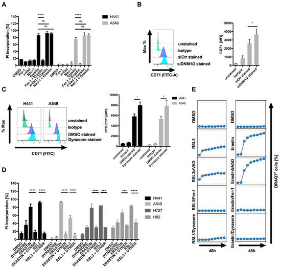 Dynasore inhibits ferroptosis. (A) The indicated cell lines were treated with DMSO, ferrostatin-1 (5 µM), erastin (10 µM), zVAD (20 µM), Nec-1 (20 µM) or the indicated combinations for 48 h. Cell death was quantified by propidium iodide (PI) uptake and flow cytometry. (B) H441 cells were transfected with control or dynamin 1 and 2 (DNM1-2)-targeting small interfering RNA (siRNA) for 48 h. Surface expression of CD71 was determined by staining and flow cytometry. (C) The indicated cells were treated with dynasore for 48 h. Surface expression of CD71 was quantified as in B. (D) Cells as indicated were treated and quantified as in A, but replacing ferrostatin-1 by dynasore (80 µM). (E) A549 cells were treated with DMSO, ferrostatin-1 (5 µM), erastin (10 µM), zVAD (20 µM), dynasore (80 µM) or the indicated combinations. Images were acquired every 8 h for 48 h. Dead cells were quantified as % DRAQ7 + cells using the IncuCyte image analysis software. All data are means +/− standard error of the mean (SEM) of at least three independent experiments, or representative images where applicable. MFI—mean fluorescence intensity. * indicates p < 0.05; ** indicates p < 0.01; *** indicates p < 0.001; **** indicates p < 0.0001; ns indicates non-significant differences.