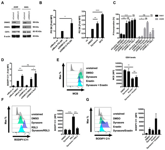 Dynasore blocks ferroptosis independently of dynamin 1 and 2. (A) Cells were subjected to control or dynamin 1 and 2 (DNM1-2)-targeting siRNA for 48 h, a representative blot is shown. (B) H441 cells (left panel) were stained by Phen Green SK staining (PG SK) or treated with dynasore (80µM) or DFO (100 µM) for 48 h (right panel). Fold mean fluorescence intensity (MFI) was determined by flow cytometry. (C) Cells as in A were treated with DMSO, erastin (10 µM) or RSL3 (1 µM) for 48 h. Cell death was determined by propidium iodide (PI) uptake and flow cytometry. (D) H441 cells were transfected with dynamin 1 and 2 (DNM1-2)-targeting siRNA for 48 h, followed by 5 h treatment with RSL3 (1µM). During the last 30 min, BODIPY C11 was added at 5 µM to each well. Mean fluorescence intensity (MFI) was quantified by flow cytometry. (E) H441 cells were treated with DMSO, erastin (10 µM), dynasore (80 µM) or both for 16 h and 48 h, respectively. During the last 30 min monochlorobimane (MCB) was added at 50 µM to each well. Mean fluorescence intensity (MFI) was quantified by flow cytometry. (F,G) H441 cells were treated with RSL3 (1µM) for 5 h or erastin (10 µM) for 16h. During the last 30 min BODIPY C11 was added at 5 µM to each well. Mean fluorescence intensity (MFI) was quantified by flow cytometry. All data are means +/− SEM of at least three independent experiments, or representative images where applicable. * indicates p < 0.05; ** indicates p < 0.01; *** indicates p < 0.001; **** indicates p < 0.0001; ns indicates non-significant differences.
