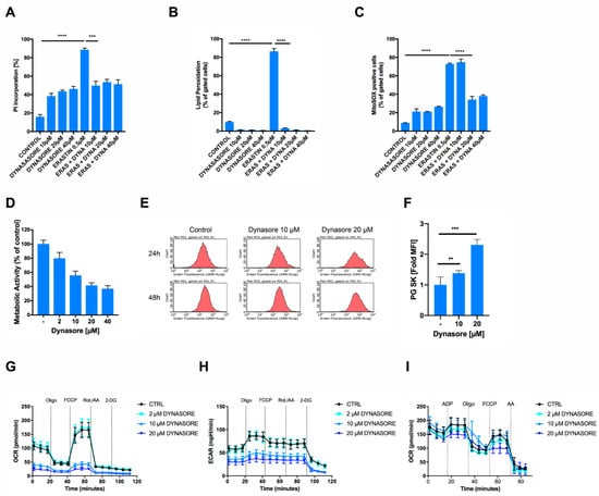 Dynasore has previously been shown to protect neurons from cell death after spinal cord injury in vivo [15]. However, the question of how dynasore may protect neurons from cell death has remained unexplored. Given that we found dynasore to block ferroptosis and ferroptosis is a cell death etiology linked to neuronal death, for example, in model systems of neurodegeneration in vitro [19,25] and in spinal cord injury in vivo [26], we next tested whether dynasore would also protect cells of neuronal origin from ferroptosis. Indeed, neuronal cells were sensitive to induction of ferroptosis by erastin and cell death could be reverted by rising concentrations of dynasore, albeit at the cost of a certain level of cell death induced by dynasore alone in these cells (Figure 3A). Supporting a functionality of dynasore in preventing ferroptosis also in neuronal cells, erastin-induced accumulation of lipid ROS was entirely reversed by co-treatment with dynasore (Figure 3B). Interestingly, apart from its activity on lipid ROS accumulation, we noted that dynasore also significantly blocked erastin-induced mitochondrial superoxide, as determined by mitoSOX staining (Figure 3C; Supplementary Figure S3A). Of note, mitochondrial superoxide is a known byproduct of oxidative phosphorylation. Therefore, we hypothesized that dynasore may affect mitochondrial superoxide production via inhibiting mitochondrial metabolic activity. To test this, we measured the metabolic activity of cells treated with rising concentrations of dynasore using their capacity to convert 3-(4,5-dimethylthiazol-2-yl)-2,5-diphenyltetrazolium bromide (MTT) to formazan. Indeed, dynasore inhibited cellular metabolic activity in a dose-dependent manner (Figure 3D). In addition, dynasore also reduced PG SK fluorescent quenching and thereby intracellular free iron levels over time in neuronal cells (Figure 3E,F), suggesting that this reduced iron availability may impact the respiratory chain and thereby mitochondrial ROS production. Indeed, dynasore treatment very effectively blocked basal cellular oxygen consumption rates (OCR) and maximal respiratory capacity, measured after adding the uncoupler carbonyl cyanide-p-trifluoromethyoxyphenylhydrazone (FCCP) to intact cells (Figure 3G). Similarly, extracellular acidification rates (ECAR) were strongly suppressed by dynasore (Figure 3H). Of note, another small molecule inhibitor against the dynamin family member dynamin-related protein 1 (Drp1), mdivi-1, was shown to block mitochondrial complex I-dependent oxygen consumption, and reverse electron transfer-mediated ROS production [27]. Therefore, in order to test whether dynasore may similarly directly affect complex I activity or mitochondrial respiration in general, we tested the effect of dynasore on the respiratory capacity of isolated mitochondria in cell-free systems, as was done previously [20]. However, in these cell-free systems, dynasore did not directly affect mitochondrial respiration (Figure 3I). In particular, the pronounced effects of dynasore on mitochondrial respiration in whole cells (Figure 3G) were neither achieved at the level of basal respiration nor at the other respiration states (Supplementary Figure S3B–G). Hence, in intact cells, other indirect mechanisms triggered by dynasore accounted for the observed metabolic effects.