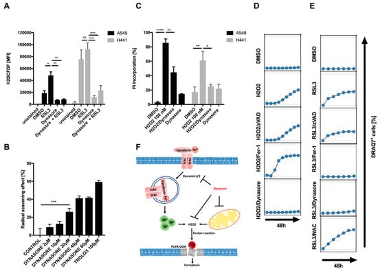 Dynasore functions as a broadly active radical scavenger. (A) Indicated cell lines were treated with DMSO, erastin (10 µM), dynasore (80 µM) or both for 16 h and 48 h, respectively. During the last 30 min H2DCFDF was added at 20 µM to each well. Mean fluorescence intensity (MFI) was quantified by flow cytometry. (B) Dynasore (2–60 µM) and trolox (100 µM) were incubated with DPPH (100 µM) for 30 min in the dark, then absorbance was measured at 517 nm to determine the radical scavenging activity. (C) Cells as in A were treated with DMSO, H2O2 (100 nM), Dynasore (80 µM) or both for 48 h. Cell death was determined by propidium iodide (PI) uptake and flow cytometry. (D,E) A549 cells were treated with DMSO, H2O2 (100 nM) or RSL3 (1 µM) alone or in combination with zVAD (20 µM), Fer-1 (5 µM), dynasore (80 µM) or NAC (1.5 mM). Images were acquired every 8 h for 48 h. Dead cells were quantified as % DRAQ7 + cells using the IncuCyte image analysis software. (F) Schematic overview of proposed mechanism of dynasore-mediated inhibition of ferroptosis. All data are means +/− SEM of three independent experiments or representative images where applicable. * indicates p < 0.05; ** indicates p < 0.01; *** indicates p < 0.001; **** indicates p < 0.0001; ns indicates non-significant differences.