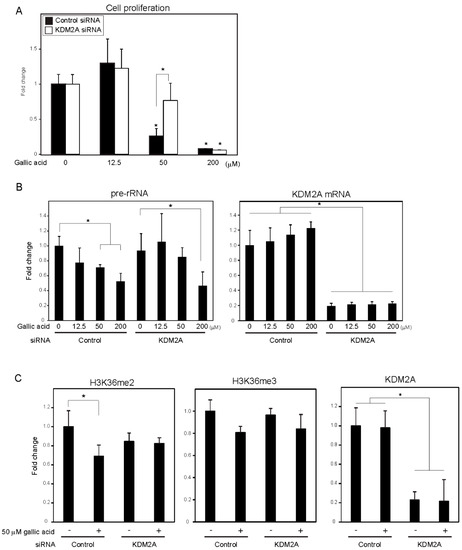 Gallic acid induced KDM2A-dependent reductions of cell proliferation, rRNA transcription, and H3K36me2 in rDNA promoter in MCF-7 cells. (A) Gallic acid decreased proliferation of MCF-7 cells through KDM2A. MCF-7 cells transfected with control siRNA or siRNA for KDM2A were cultured with gallic acid as indicated concentrations for 2 days. Cell numbers were measured by CyQUANT® Direct Cell Proliferation Assay detecting DNA content. (B) The treatment with 50 μM gallic acid reduces rRNA transcription through KDM2A. MCF-7 cells transfected with control siRNA or siRNA for KDM2A were treated with gallic acid at indicated concentrations for 4 h. Total RNAs were isolated and analyzed by quantitative real-time PCR (qRT-PCR) to detect rRNA transcription (pre-rRNA) (left panel) and KDM2A mRNA (right panel). The ratios of the values for cells treated with various conditions to those for cells treated with control siRNA without gallic acid are shown. (C) KDM2A-dependent reduction of H3K36me2 marks in rDNA promoter by treatment with 50 μM gallic acid. MCF-7 cells transfected with control siRNA or siRNA for KDM2A were treated with 50 μM gallic acid for 4 h. The levels of H3K36me2, H3K36me3, and KDM2A in the rDNA promoter were analyzed by ChIP assay. The results are expressed as fold changes of the values under various conditions to those in cells cultured with control siRNA without gallic acid treatment. All experiments were performed more than three times, and the mean values with standard deviations are indicated. * p < 0.05.