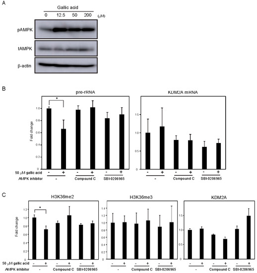 It was reported that gallic acid produces ROS [25,26], and ROS widely affects cellular activities. We found that the gallic acid treatment increased intracellular ROS (Figure 2). The NAC or GSH treatment, which reduced the intracellular level of ROS, impaired the reductions of rRNA transcription and the H3K36me2 level in rDNA promoter induced by 50 μM gallic acid (Figure 2). These results suggest that the ROS increase by gallic acid is required for induction of KDM2A activity to reduce rRNA transcription by gallic acid. However, oxidative stress by H2O2 alone did not activate the KDM2A demethylase activity in the rDNA promoter (Figure S3). We found that gallic acid activated AMPK, and AMPK activity was required for the activation of KDM2A by gallic acid (Figure 3). There results show that gallic acid elevates ROS production and AMPK activation, both of which are required for the activation of KDM2A to reduce rRNA transcription.