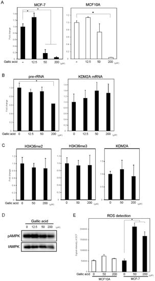 Gallic acid does not induce KDM2A activity to reduce cell proliferation in non-tumorigenic MCF10A cells. (A) The effects of gallic acid on cell proliferation of MCF10A cells. MCF-7 cells and MCF10A cells were treated with gallic acid as indicated concentrations. After culture for 2 days, cell numbers were analyzed by the same method as Figure 1A. The experiments were performed four times (n = 4), and the mean values with standard deviations are indicated. * p < 0.05. (B) The effects of gallic acid on rRNA transcription in MCF10A cells. The MCF10A cells were treated with gallic acid as indicated concentrations for 4 h. Total RNAs were isolated and analyzed by qRT-PCR to detect pre-rRNA (left panel) and KDM2A mRNA (right panel). The ratios of the values for cells treated with various concentrations of gallic acid to those for cells treated without gallic acid are shown. The experiments were performed three times (n = 3), and the mean values with standard deviations are indicated. * p < 0.05. (C) The effects of gallic acid on H3K36me2 mark in the rDNA promoter of MCF10A cells. MCF10A cells were treated with gallic acid at indicated concentrations for 4 h. The levels of H3K36me2, H3K36me3, and KDM2A in the rDNA promoter were analyzed by ChIP assay. The results are expressed as fold changes to the values with gallic acid to those without gallic acid. The experiments were performed three times (n = 3), and the mean values with standard deviations are indicated. (D) The effects of gallic acid on AMPK activation in MCF10A cells. MCF10A cells were treated with gallic acid as indicated concentrations for 4 h. Cells were lysed and the levels of phosphorylated-AMPKα (Thr172) (pAMPK) and total AMPKα (tAMPK) were analyzed by immunoblotting. (E) The effect of gallic acid on ROS production in MCF10A cells. MCF-7 cells and MCF10A cells were treated with or without gallic acid for 4 h. Cells were analyzed for ROS production by DCFDA probe as in Figure 2A. The experiments were performed four times (n = 4), and the mean values with standard deviations are indicated. * p < 0.05.
