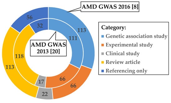 Categorized responses of published work citing the AMD GWAS of Fritsche et al. 2013 [20] and Fritsche et al. 2016 [8]. After quality control (see Methods), 337 publications cited Fritsche et al. (2013) (inner circle) [20] during the period 2013–2020 and 366 publications referred to Fritsche et al. (2016) (outer circle) [8] during the period 2016–2020. Articles were manually assigned to one of the five categories: “Genetic association study” (light blue), “Experimental study” (orange), “Clinical study” (grey), “Review article” (yellow), or “Referencing only” (dark blue). Articles citing both AMD GWAS [8,20] were only included in the Fritsche et al. 2016 [8] evaluation. Multi-assignment of categories was allowed for the categories “Genetic association study” and “Experimental study”. This was the case for seven studies citing Fritsche et al. 2013 [20] and four studies citing Fritsche et al. 2016 [8] (Tables S1 and S2).