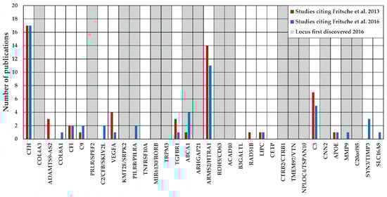Next, we focused on the question whether publications citing the AMD GWAS of Fritsche et al. 2013 [20] or 2016 [8] addressed a defined genomic region. The latest GWAS of Fritsche et al. 2016 reported 34 loci to be AMD-associated with genome-wide significance [8], with these loci serving as reference in our analysis. Referring to Fritsche et al. 2013 [20], a total of 74 publications assigned topically to “Genetic association study” or “Experimental study” investigated a specific locus, whereas this was the case for 49 studies citing Fritsche et al. 2016 [8]. Remarkably, not all analyzed loci harbored variants associated with AMD at genome-wide significance, which results in 58.1% (43/74, Fritsche et al. 2013), respectively 77.6% (38/49, Fritsche et al. 2016) of studies for the analysis of AMD-associated loci. Furthermore, several studies investigated more than one locus, resulting in 55 investigated loci by studies citing Fritsche et al. 2013 [20] and 55 loci for studies referring to Fritsche et al. 2016 [8] (Figure 2).