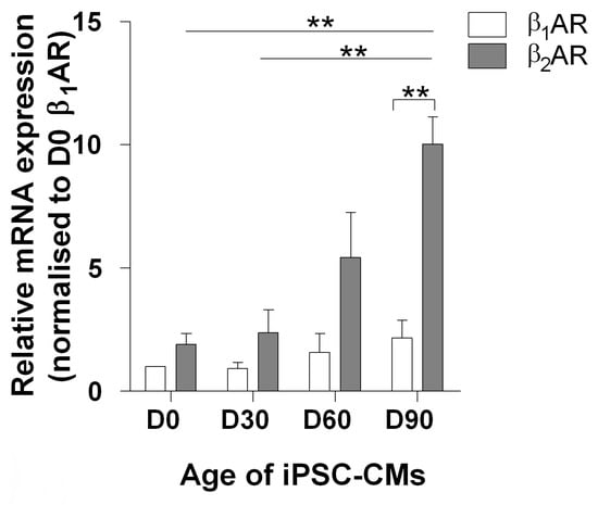 Stimulation of βAR with isoprenaline induces dose-dependent cAMP release. Differential ADRB1 and ADRB2 gene expression in iPSCs (D0) and iPSC-CMs after 30, 60, and 90 days of differentiation. n/N = 3/3; n/N = replicates/batches. Data shown as mean ± SEM, ** p < 0.01 between marked groups; β2AR D0 vs. β2AR D90, β2AR D30 vs. β2AR D90, and β1AR D90 vs. β2AR D90 (1-way ANOVA with Tukey’s post hoc test).