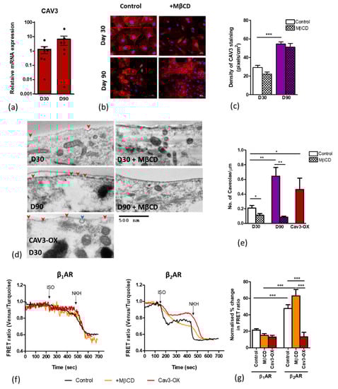 Age-dependent maturation specifically increases the caveolae content. (a) CAV3 gene expression in prolonged culture (n/N = 7/3). (b) Immunofluorescence staining for caveolin-3 (red) at D30 and D90. Nuclei are stained with DAPI (blue); (c) quantification of Cav3 protein density shows a significant increase from D30 (n/N = 19/3) to D90 (n/N = 13/3) *** p < 0.001 between D30 and D90. (d) TEM images showing surface caveolae (indicated with red arrows; clathrin pit is indicated with blue arrow) in control ± MβCD treatment, aged iPSC-CMs to D90 ± MβCD, and in Cav3-OX iPSC-CMs; (e) quantification of the caveolae density on the cell membrane in D30 control (n/N= 45/2), D30 MβCD-treated (n/N = 37/2), D90 control (n/N = 10/2), D90 MβCD (n/N= 13/2), and Cav3-OX (n/N = 12/1) cells. Data are presented as mean ± SEM. Significance was determined by one-way ANOVA with Bonferroni’s post-hoc test. * p < 0.05, ** p < 0.01; (f) representative FRET traces in control (black), MβCD-treated (orange), and Cav3-OX (red) iPSC-CMs (D30) upon either β1AR or β2AR stimulation with isoprenaline (30 µM) in the presence of a specific blocker (CGP (100 nM) or ICI (50 nM), respectively) and, subsequently, the addition of NKH (10 µM) for adenyl cyclase stimulation. (g) The percentage change in the FRET ratio upon β1AR stimulation in control (n/N = 97/11), +MβCD (n = 62/11), and Cav3-OX (n = 6/2); and β2AR stimulation in control (n/N = 38/4), +MβCD (n = 28/3), and Cav3-OX (n/N = 9/2). Percentage change was calculated and normalised to the maximal cAMP released by the NKH477 stimulation. Data are presented as mean ± SEM. Significance was determined by one-way ANOVA with Bonferroni’s post-hoc test. *** p < 0.001. n/N = cells/batches.