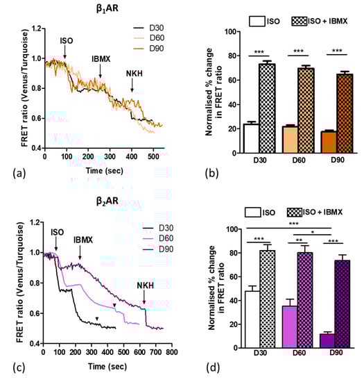 As aged cells displayed a greater abundance of caveolae components, we investigated the compartmentation of β2AR within caveolae by conducting βAR-cAMP FRET experiments, as iPSC-CMs are aged from D30 to D90. We investigated the basal level of cAMP release upon the βAR-dependent stimulation with ISO. We found that the β1AR-cAMP output remains unaltered from D30 to D90 (Figure 3a,b). Interestingly, however, the β2AR-cAMP is significantly reduced from a 47.69% cytoplasmic cAMP output at D30 to 11.54% at D90 (p < 0.001) (Figure 3c,d). With the pan-inhibition of all PDEs with a non-selective PDE inhibitor, IBMX, we observe a consistent increase in cAMP to a similar value at all time points after both β1AR and β2AR stimulation. This is consistent with cAMP production within a compartment separate from the main cytosol, spatially constrained by phosphodiesterase activity. While the β1AR-cAMP does not change from 30 to 90 days, the β2AR-cAMP becomes increasingly compartmentalised.