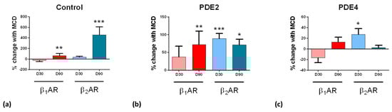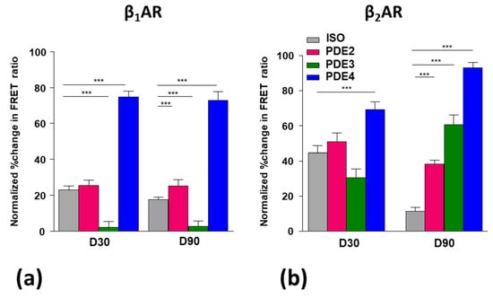 Following PDE2 inhibition, both the β1AR- and β2AR- dependent cAMP signals increased but only on D90 (Figure 4a,b), which suggests the involvement of this PDE only at later stages of maturation.