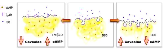 Schematic illustrating the changes in β2AR regulation, cAMP level, and caveolae upon the removal of cholesterol and upon the maturation of iPSC-CMs from D30 to D90.