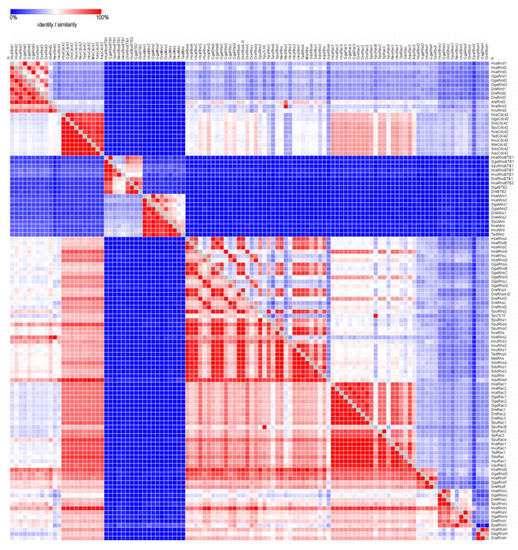 - Campanella, J.J.; Bitincka, L.; Smalley, J. MatGAT: An application that generates similarity/identity matrices using protein or DNA sequences. BMC Bioinform. 2003, 4, 29. [Google Scholar] [CrossRef]