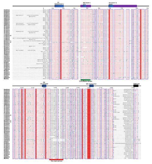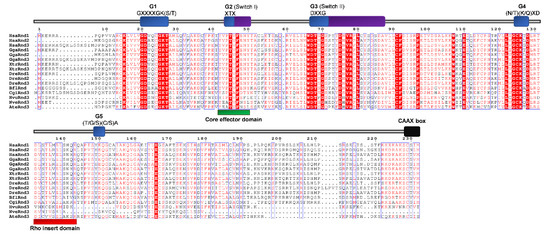 Sequence alignment of the Rnd subfamily. The amino acid sequences of Rnd GTPases were aligned using ClustalX, the secondary structures predicted using ESPript. Regions of the Rnd proteins are indicated above the alignment; blue are the G domains, (G1, G2, G3, G4, and G5 with their respected motifs), purple are switch 1 and switch 2 domains, red is the Rho insert, green is the core effector domain, and black is the CAAX box. Blue frames are indicators of the conserved residues; white letters in red boxes represent identity, and red letters in white boxes represent similarity.