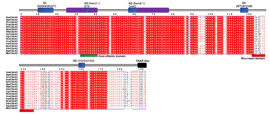 Ćetković and coworkers [] inspected 13,000 partial cDNA sequences (ESTs) from the marine sponge Suberites domuncula and identified cDNA sequences coding for three homologs in Metazoa, named SdRho1, SdRho2 (SdRhoA), SdRho3. All three proteins from S. domuncula have the Rho GTPase domain characteristic for Rho subfamily members and are responsible for nucleotide binding and hydrolysis (G1–5 boxes) and two regions that specifically bind regulators or effectors—the switch 1 and 2 regions. In addition, all of them have the Rho insert, the C-terminal CXXX motif (C: cysteine, A: aliphatic, X: any amino acid), which undergoes post-translational lipid modifications responsible for membrane targeting, and a polybasic region adjacent to the CAAX motif which contributes to association to membranes, interaction with regulators, and subcellular localization (Figure 5) [].