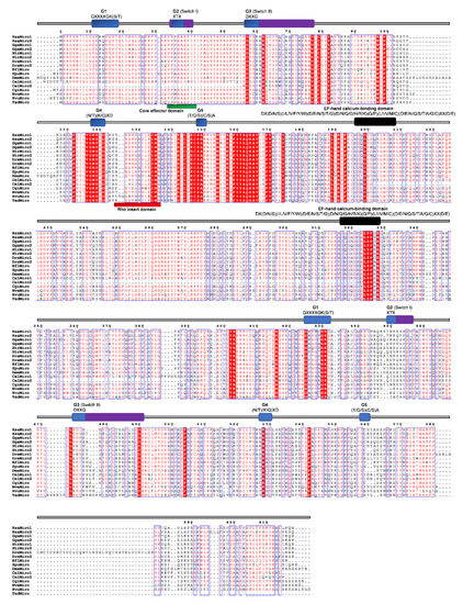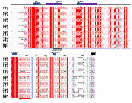 Conserved domains and motifs were identified by simple modular architecture research tool prediction (SMART; http://smart.embl-heidelberg.de/) and further confirmed through sequence alignment (ClustalX) with Rho proteins generated by ESPript (http://espript.ibcp.fr/ESPript/ESPript/) (Figure 5, Figure 6, Figure 7, Figure 8, Figure 9 and Figure 10). We used human Rho proteins with a completely resolved protein architecture as reference sequences. In order to determine the phylogenetic relationships of the Rho homologs in the basal Metazoa and known Rho proteins from Mammalia, Aves, Amphibia, Chordata, Cephalochordata, Echinodermata, Arthropoda, Nematoda, and Mollusca, we constructed a phylogenetic tree using the maximum likelihood algorithm in the MEGA 7 (Figure 2) []. Our phylogenetic analysis confirmed that the Rho family of small GTPases can be divided into nine major subfamilies: Rho, Rac, Cdc42, Rnd, RhoDF, RhoUV, RhoH, RhoBTB, and Miro. The members of these subfamilies in basal Metazoa were categorized according to their phylogenetic clustering (Figure 2.).