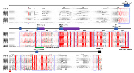 Sequence alignment of the RhoUV subfamily. The amino acid sequences of RhoUV GTPases were aligned using ClustalX, the secondary structures predicted using ESPript. Regions of the RhoUV proteins are indicated above the alignment; blue are the G domains, (G1, G2, G3, G4, and G5 with their respected motifs), purple are switch 1 and switch 2 domains, red is the Rho insert, green is the core effector domain, and black is the CAAX box. Blue frames are indicators of the conserved residues; white letters in red boxes represent identity, and red letters in white boxes represent similarity.