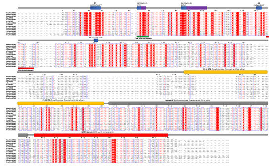 Sequence alignment of the RhoBTB subfamily. The amino acid sequences of RhoBTB GTPases were aligned using ClustalX, the secondary structures predicted using ESPript. Regions of the Rho proteins are indicated above the alignment; blue are the G domains, (G1, G2, G3, G4, and G5 with their respected motifs), purple are switch 1 and switch 2 domains, orange the first BTB domain, gray the second BTB domain, and red represents the C-terminus back domain. Blue frames are indicators of the conserved residues; white letters in red boxes represent identity, red letters in white boxes represent similarity.