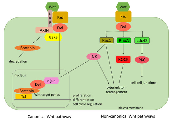 A simplified representation of the canonical and non-canonical Wnt signaling pathway. Small Rho GTPases are involved only in the non-canonical Wnt pathways. Wnt–Wnt family member; Fzd—Fizzled class receptor; Dvl—disheveled segment polarity protein; Rac1—Rac family small GTPase 1; Rho A—Ras homolog family member A; cdc42—cell division cycle 42; JNK—c-Jun N-terminal kinase; ROCK—Rho-associated coiled-coil containing protein kinase; PKC—protein kinase C; c-jun—Jun proto-oncogene; GSK3—glycogen synthase kinase 3; LRP—low-density-lipoprotein (LDL) receptor-related protein; Tcf—transcription factor.