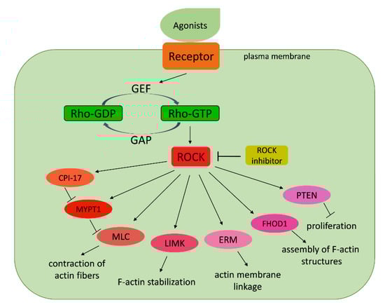 Simplified representation of the Rho/ROCK signaling pathway. GEF—guanine nucleotide exchange factor; GAP—GTPase activating protein; Rho—Ras homolog family member (activated if linked to GTP); ROCK—Rho-associated coiled-coil containing protein kinase; CPI-17—protein phosphatase 1 regulatory inhibitor subunit 14A; MYPT1—myosin phosphatase target subunit 1; MLC—myosin light-chain kinase; LIMK—LIM domain kinase; ERM—acronym from ezrin, radixin, moesin proteins; FHOD1—formin homology 2 domain containing 1; PTEN—phosphatase and tensin homolog.