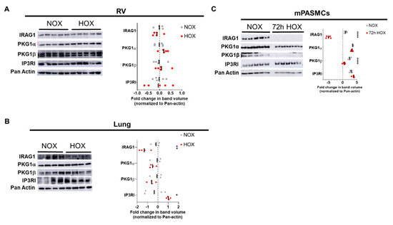 IRAG1 is downregulated in hypoxic mice lungs and isolated mice pulmonary arterial smooth muscle cells under hypoxic condition. (A,B) Western blots of protein lysates isolated from normoxic and hypoxic mice right ventricles (A) and lungs (B). Representative blot pictures are on the left and subsequent lognormal values of densitometry quantification are on the right. (C) Smooth muscle cells isolated from mice pulmonary arteries were cultured either in normoxia or hypoxia (1% O2) for 72 h. Representative western blot pictures of protein lysates from these cells are on the left and subsequent lognormal values of densitometry quantification are on the right. Densitometry was performed in the same blot pictures as presented here and n number corresponds to different animals in the same experiment. Number of animals used: (A) Right ventricles from five normoxic and five hypoxic WT mice; (B) lungs from four normoxic and four hypoxic WT mice; (C) mPASMCs isolated from five wildtype (WT) mice. Primary antibodies used in western blots were IRAG1, PKG1α, PKG1β, and IP3RI. Pan-actin was used as housekeeping gene. Fold change was calculated in relation to normoxic controls. All the western blot quantification data were represented as individual point and bar indicates the mean, * p < 0.05, ** p < 0.01, *** p < 0.001, **** p < 0.0001, two-tailed unpaired t-Test.