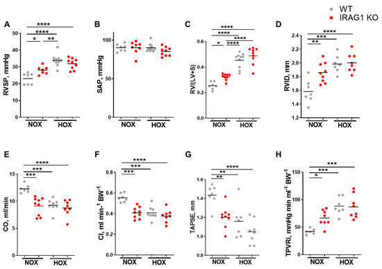 Disruption of IRAG1 gene in mice showed signs of right ventricular dysfunction in normoxic conditions. (A–H) WT and IRAG1 KO mice were kept under normoxic or hypoxic (10% O2) for five weeks and then evaluated for echocardiographic variables and went through right heart catheterization. Variables measured were right ventricular systolic pressure (RVSP, A), systemic arterial pressure (SAP, B), ratio of right ventricular weight to left ventricular wall plus septum weight [{RV/(LV + S)}, C], right ventricular internal diastolic diameter (RVID, D), cardiac output (CO, E), cardiac index (CI, F), Tricuspid annular plane systolic excursion (TAPSE, G), total pulmonary vascular resistance index (TPVRI, H). Number of animals used: (A) Normoxia—seven WT and seven IRAG1 KO, hypoxia—10 WT and 9 IRAG1 KO; (B) normoxia—seven WT and eight IRAG1 KO, hypoxia—10 WT and 9 IRAG1 KO; (C) normoxia—seven WT and nine IRAG1 KO, hypoxia—10 WT and 9 IRAG1 KO; (D) normoxia—seven WT and nine IRAG1 KO, hypoxia—seven WT and eight IRAG1 KO; (E) normoxia—seven WT and nine IRAG1 KO, hypoxia—eight WT and eight IRAG1 KO; (F) normoxia—seven WT and nine IRAG1 KO, hypoxia—eight WT and eight IRAG1 KO; (G) normoxia—seven WT and nine IRAG1 KO, hypoxia—seven WT and eight IRAG1 KO; (H) normoxia—six WT and eight IRAG1 KO, hypoxia—seven WT and eight IRAG1 KO. All quantified data were represented as individual point and bar indicates the mean, * p < 0.05, ** p < 0.01, *** p < 0.001, **** p < 0.0001, comparison of multiple groups were performed by one-way ANOVA, followed by Tukey’s multiple comparisons test between the groups.